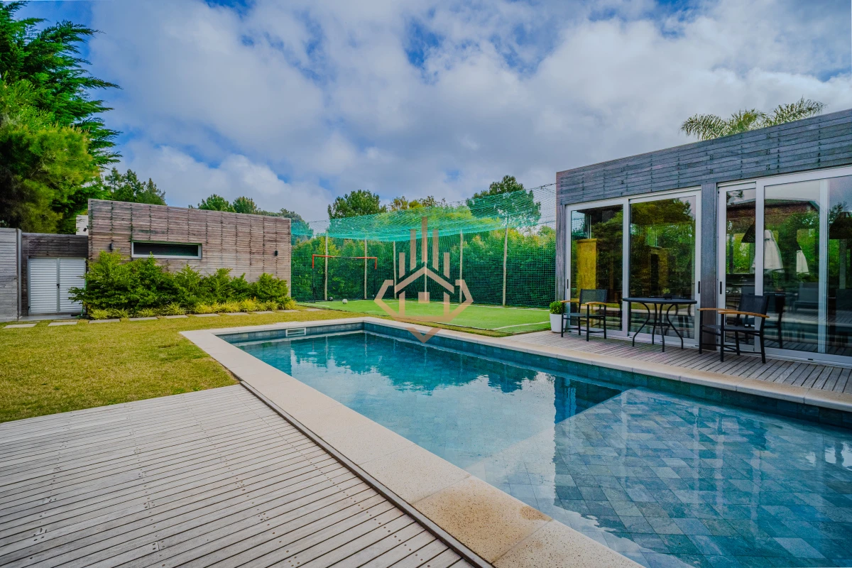 Para disfrutar al máximo del exterior, cuenta con una barbacoa completa, piscina y una cancha de fútbol con pasto sintético, ideales para reuniones y asados en un entorno relajado.